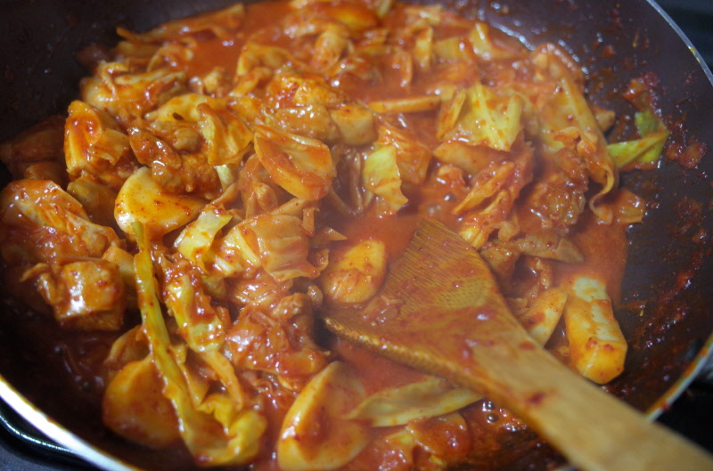 해동을 조금 오래 해서 부드러워지면 양배추를 조금 볶은 다음에 넣어줬습니다.